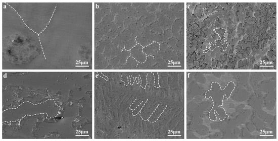 SEM micrographs of the AlCrTiV0.5Cux lightweight HEAs. (a) x = 0; (b) x = 0.2; (c) x = 0.4; (d) x = 0.6; (e) x = 0.8; (f) x = 1.0.