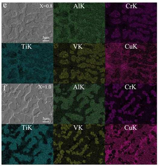 Elemental EDS mapping of AlCrTiV0.5Cux lightweight HEAs. (a) x = 0; (b) x = 0.2; (c) x = 0.4; (d) x = 0.6; (e) x = 0.8; (f) x = 1.0.
