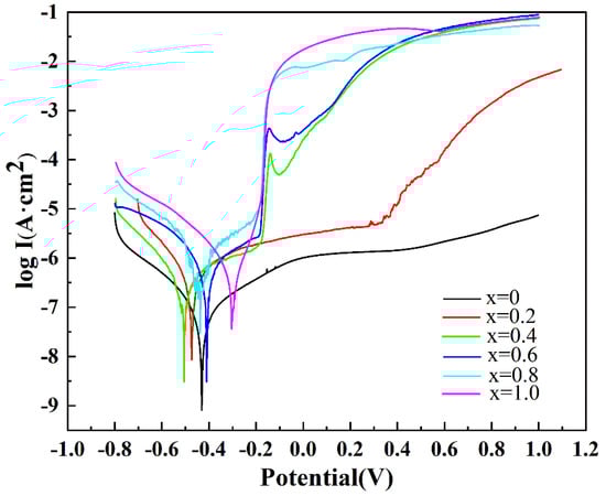 Potentiodynamic polarization curves of AlCrTiV0.5Cux lightweight HEAs in 0.6 M NaCl solution.