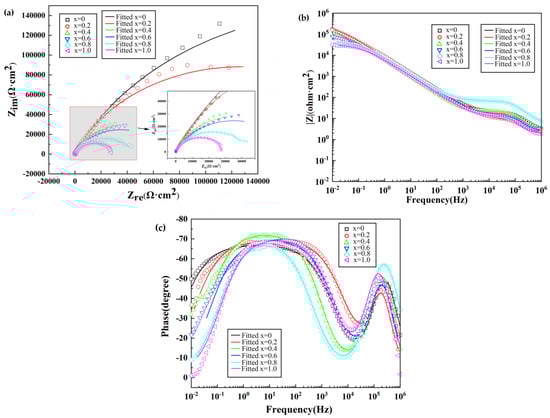Fitted electrochemical AC impedance of AlCrTiV0.5Cux lightweight HEAs in 0.6 M NaCl solution. (a) Nyquist plot; (b) Bode plot; (c) Phase angle plot.