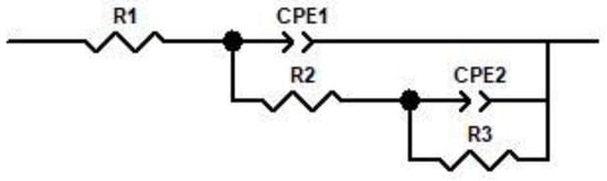 The data on the impedance are used in the production of an equivalent electric circuit (EEC) (shown in Figure 7). R1 represents the resistance of the solution in the EEC model, R2 represents the resistance of the passivated layer, and R3 represents the charge transfer resistance of the limited corrosion zone. In the zone that has been passivated, the capacitance is represented by CPE1, and in the zone that has been partly corroded, it is represented by CPE2. A constant phase-angle element, also known as a CPE, is used in place of a traditional capacitor so that flaws in capacitive components, such as surface inhomogeneities, may be taken into consideration. If the value of the charge transfer resistance, or R3, is lowered, then a greater number of electrons and ions will be able to flow through the passivation layer created by the alloy, which will result in a reduction in the alloy’s resistance to corrosion [36,37,38,39].