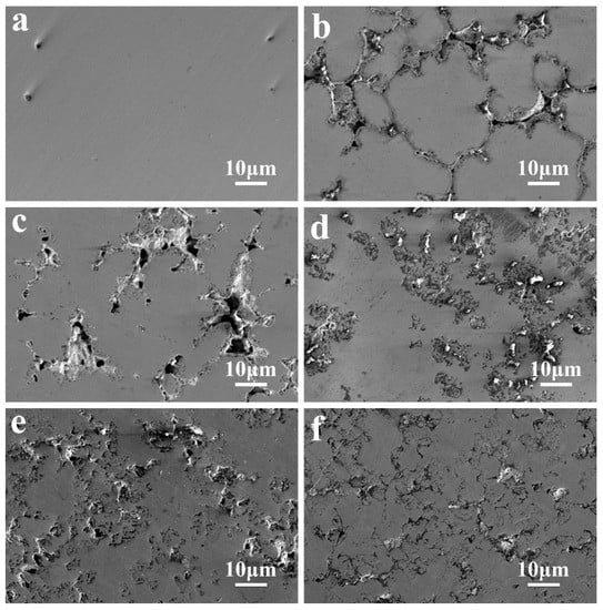 Surface morphology of AlCrTiV0.5Cux lightweight HEAs after kinetic potential polarization tests in 0.6 M NaCl solution. (a) x = 0; (b) x = 0.2; (c) x = 0.4; (d) x = 0.6; (e) x = 0.8; (f) x = 1.0.