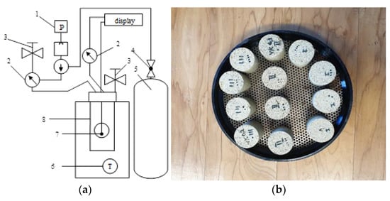 Technological system of samples hardening in CO2 environment (a) and hardened samples (b): 1—pneumatic pump; 2—manometers; 3—shutters; 4—ball valve; 5—CO2 gas cylinder; 6—temperature sensor; 7—autoclave; 8—heater-thermostat.