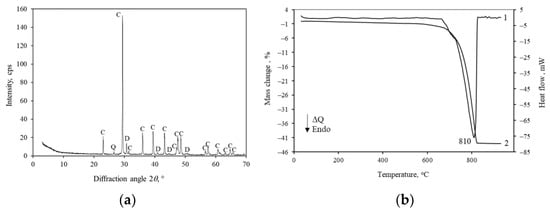 XRD pattern (a) and STA curves (b); 1—DSC, 2—TG of Karpenai limestone. Indexes: C—calcite, D—dolomite, Q—quartz.
