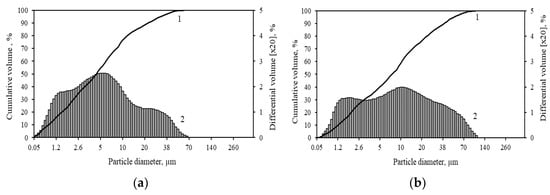 Particle size distribution of limestone (a) and clay (b), where 1—cumulative volume, 2—differential volume.