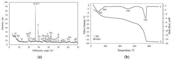 X-ray diffraction analysis (Figure 4a) shows that quartz, in the form of sand, prevails in Saltiskiai clay. Among the clay minerals, the peaks of the highest intensity are characteristic of the minerals of the mica group—illite [K,H3O)Al2Si3AlO10(OH)2] (PDF No. 00-026-0911). There are also small peaks of montmorillonite [Na,Ca)0.33(Al,Mg)2(Si4O10)(OH)2·nH2O] (PDF No. 00-026-0911), muscovite [Kal2(AlSi3O10)(F,OH)2] (PDF No. 00-019-0814) and kaolinite [Al2Si2O5(OH)4] (PDF No. 00-03-0052). Calcite and dolomite, i.e., carbonates, were found. They are useful as a partial source of CaO for the synthesis of rankinite. STA results (Figure 4b) indicate the characteristic features of mica carbonaceous clays. The following three main peaks were observed: (1) the loss of the absorbed water (up to 150 °C), (2) organic matter burning (300–450 °C), and (3) the decomposition of dolomite and calcite (650–750 °C) []. The mass loss within the temperature range of 450–600 °C is 1.46 wt%. This is most likely due to the fact that Saltiskiai clay consists of a low amount of kaolinite and montmorilonite.
