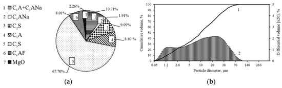 Mineralogical (a) and granulometric (b) composition of OPC clinker, where 1—cumulative volume, 2—differential volume. Indexes: C3S—alite, C2S—belite, C3A—calcium aluminum oxide, C3Ana—sodium calcium aluminum oxide, C4AF—calcium aluminum iron oxide, MgO—periclase.