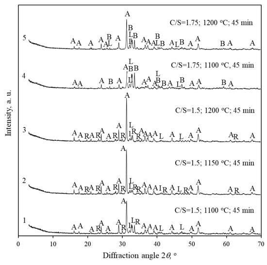 XRD patterns of Karpenai limestone—Saltiskiai clay mixtures fired at different temperatures. Indexes: A—akermanite, B—bredigite, R—rankinite, L—larnite.