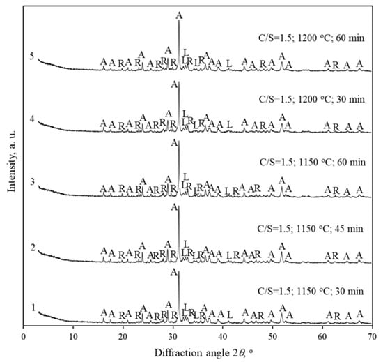 It was decided to investigate the influence of the sintering duration on the rankinite formation processes. The mixture with CaO/SiO2 = 1.5 was fired for 30 and 60 min at 1150 and 1200 °C.The data are presented in Figure 8.