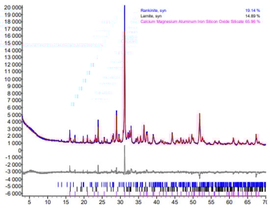 Unfortunately, according to the XRD data, it appears that the mixture contains a significantly higher quantity of akermanite. The orientation in 2 1 1 plane (d –0.2866 nm) was used. Reliability values: Rexp—2.61; Rwp—5.67; GOF—2.17. This would not be surprising since it is well known that additional divalent and trivalent metal ions can be inserted into the crystal lattice structure of this compound, thus increasing the amount of akermanite in the synthesis product. In order to clarify this and determine the exact quantitative composition of the binder, a Rietveld refinement analysis was performed. The original data are shown in Figure 9, and its graphical representation is provided in Figure 10.