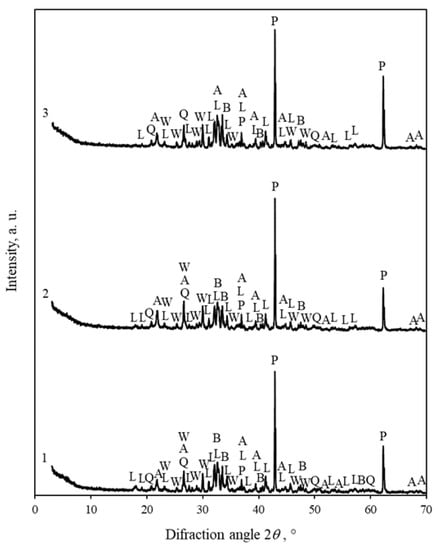 XRD patterns of akermanite synthesized for 1 h (1) and after 24 h of carbonization at 25 °C (2) and 45 °C (3). Indexes: A—akermanite, Q—quartz, W—wollastonite, L—larnite, B—bredigite, P—periclase.