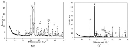 XRD patterns of JSC Akmenes cementas OPC clinker (a) and after 24 h of carbonization of samples at 45 °C (b). Indexes: A—alite, B—belite, CA—tricalcium alumina, F—calcium aluminum iron oxide, P—periclase, N—sodium calcium aluminum oxide, C—calcite, Q—quartz.