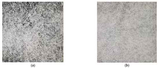 The area base weight of nonwovens was determined by cutting out and weighing square sections of 10 × 10 cm (100 cm2) out of the nonwovens according to DIN EN ISO29073-1. To analyze the homogeneity of the nonwoven, three samples were taken across the CD and also in the MD (see squares in Figure 2). To obtain a “higher resolution” of the base weight distribution across CD, five smaller round sections of 1 cm in diameter (0.782 cm2) were cut out of the three samples across CD (yellow scheme in Figure 2). The coefficient of variation (cv-value) of the 15 measurement values was calculated as a robust characteristic value for the nonwoven homogeneity.