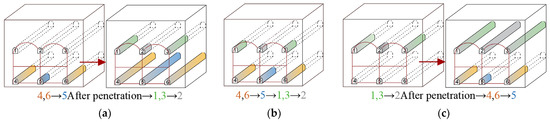 Diagram of six pilot tunnel excavation schemes: (a) plan 1; (b) plan 2; (c) plan 3; (d) plan 4; (e) plan 5; (f) plan 6.