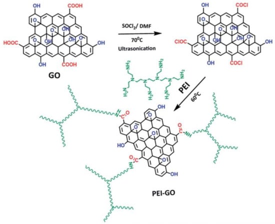 PEI can also be used to form hybrids with inorganic material, such as grapheme oxide (GO), to further improve the inhibition performance. As shown in Figure 10, Quraishi et al. [73] modified GO with PEI via facile amidation and investigated its corrosion inhibition of carbon steel in a solution of 15% HCl. According to the weight loss experiment, the PEI-GO alone provided a high corrosion inhibition efficiency of 88.2% at a temperature of 65 °C. Moreover, KI can further increase IE to 95.8% due to their synergistic effect.