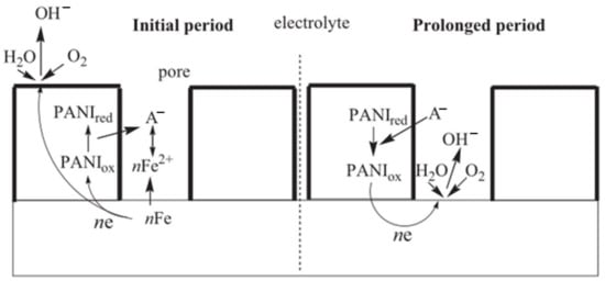 - Torresi, R.M.; de Souza, S.; da Silvaa, J.E.P.; de Torresi, S.I.C. Galvanic coupling between metal substrate and polyaniline acrylic blends: Corrosion protection mechanism. Electrochim. Acta 2005, 50, 2213–2218. [Google Scholar] [CrossRef]