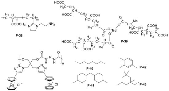 In addition to introducing additional adsorption sites to polymeric inhibitors, low surface energy monomers have also been used in the design of efficient inhibitor. Moratti et al. [52] prepared block copolymer P-6 (Figure 5) via free radical polymerization of heptafluorodecyl methacrylate and (dimethoxyphosphoryl) methyl methacrylate. The copolymers were then immobilized as a monolayer film to the surface of 316L stainless steel by treatment of dilute solutions in trifluoroacetic acid for 30 min followed by rinsing. Owing to the presence of fluorinated block and the presence of adsorption site from the phosphorus block, the resulting polymeric inhibitor exhibited excellent anti-corrosion property and long-term stability.
