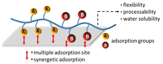 Metal corrosion has become a global problem, which not only induce accident due to the decrease in the mechanical strength, but also causes huge economic losses. Corrosion inhibitor is one of the most useful and economic strategies to protect metal materials toward different media. Generally, there are several kinds of inhibitors, including inorganic inhibitors, organic inhibitors, and polymeric inhibitors [1,2,3]. Compared with inorganic inhibitors, organic inhibitors and polymeric inhibitors are much cheaper and more powerful. More importantly, both organic inhibitors and polymeric inhibitors can be rationally designed and easily synthesized. It is well-known that the adsorption of inhibitors on the surface of metal and corresponding adhesion property performs important role in the application of inhibitors [4]. Therefore, adsorption groups are broadly used in the structure design of inhibitors. Some pioneered review papers have already summarized the progress of organic inhibitors [5,6].