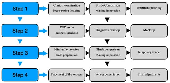 Presently, more and more clinical cases require non-prep or minimal tooth preparation to perform successful bonding, color transition, and contouring for veneers [17,35]. Figure 1 is a schematic diagram of the micro-veneer clinical visit and operation process protocol [10,12,27,28,30,31]. Step 1 mainly involves collecting patient data and making a preliminary plan. Step 2 is to create an aesthetic design based on the information. Step 3 is to make the necessary preparations for the affected tooth and collect the data about the affected tooth again. The final step is bonding the prosthesis and finishing. The second and third visits can be combined if the patient communicates, agrees, and has sufficient time. Impression materials can use alginate, silicone rubber, polyether rubber, a 3-shape oral 3D scanner, and an oral cavity model scanner to take molds.