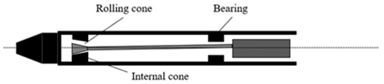 An internal vibrator is widely used and suitable for various types of concrete projects. According to structural composition and vibration mode, vibrators can be divided into pendulum-type and eccentric-type vibrators. The internal initiation structures of the two types of vibrators are shown in Figure 1 and Figure 2. When the pendulum vibrator works, it uses the rotating axis of the rolling body on the conical surface inside the vibrating rod to roll and form planetary motion to drive the rod to produce vibration. The eccentric vibrator uses the centrifugal force of the high-speed rotation of the internal mass eccentric shaft as the exciting force, which is transferred to the vibrator rod shell by the bearing. By studying the motion equations of the vibration process of the two types of vibrators, it is found that both are simple harmonic vibrations with the same frequency and amplitude along the radial direction of the vibrator rod head, which can be represented by a sinusoidal waveform (Equation (1)).