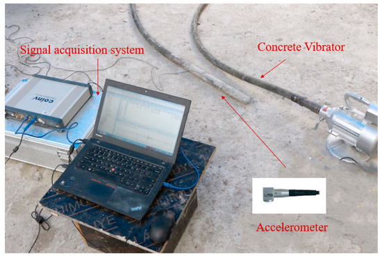 The mechanism between the vibrator and concrete in the process of concrete vibration was described in detail in Section 2.1, which also provided a theoretical basis for the vibration acceleration signal to identify the properties of the medium under vibration. In order to obtain the vibration acceleration signal during vibration, a device for the real-time acquisition of the acceleration of the vibrator rod head was designed in this paper. The equipment consisted mainly of a signal acquisition instrument and an IEPE uniaxial watertight acceleration sensor. The device connections are shown in Figure 3. The sampling rate of the acquisition instrument is adjustable from 10–200 kHz, and the sensor is rigidly connected to the vibrator and has a high installation resonance frequency. The installation and connection of the test device is simple and suitable for various types of vibrators.