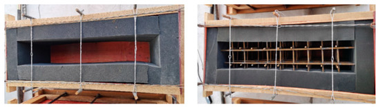In order to verify the feasibility of the above method and the accuracy of model recognition, an experiment was designed. The specific test scheme was as follows: Two wooden molds were made and vibration isolation sponges were pasted inside to eliminate the influence of the template-reflected vibration waves on the test. The structure size is shown in Figure 6. The vibration signal acquisition devices were connected to the five different internal vibrators listed in Table 1 and vibration signals under different working conditions were collected. According to the actual situation of the concrete vibration process at the engineering site, the different vibration media can be divided into air, concrete mixture, and reinforced concrete mixture, as shown in Figure 7. The air medium is the vibrator no-load, corresponding to the vibrator pull-out state in the vibrating process, while the remaining two media correspond to the states in which the vibrator is inserted into the mixture of pure concrete and reinforced concrete, as shown in Figure 8. In order to show the universality of the test, the concrete is configured with the most commonly used mix ratio, which is 0.5 w/c ratio and 150 mm slump, and the specific mix ratio is given in Table 2. In the case of reinforced concrete, the steel mesh in Figure 7 was arranged at 10 cm intervals.