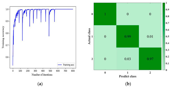 In order to evaluate the recognition ability of the network after training, Figure 9b shows the confusion matrix used to check the recognition results. Where, “0”, “1” and “2” indicate that the vibrator is in the “pulled-out state”, “inserted into plain concrete state” and “inserted into reinforced concrete state”, respectively. The state identification accuracy is 100%, 99%, and 97%, respectively. Since the damping of the concrete mix after vibration has time-varying characteristics, and the flow state of the mixture may change when the vibrator is inserted into reinforced concrete, the recognition accuracy of the “1” and “2” states is slightly lower, but the overall recognition accuracy is still at a high level. It can be seen from the training process line (Figure 9a) that although there are fluctuations in the early stage of the training process of the data set, the convergence rate is relatively fast. Therefore, the model can easily identify and classify the vibration medium of the vibrator and has good stability.