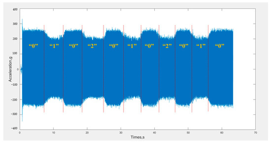 Concrete was poured into the two wooden molds described in Section 2.4, and an internal vibrator was randomly selected and connected to an acceleration sensor. The construction site vibration process was simulated, and the plain concrete and reinforced concrete mold were respectively vibrated for 5 s before pulling out, and this process was repeated five times at random insertion points. The cumulative vibration time of plain concrete mold insertion was about 15 s, and the cumulative vibration time of reinforced concrete mold insertion was about 10 s. An example of the collected vibration acceleration signals is shown in Figure 10.