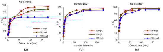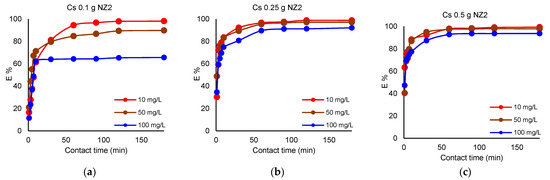 The experiments were carried out using different NZ1 and NZ2 dosages (0.5, 1, 2 g) which were contacted with 50 mL of Cs+ and Sr2+ solution (concentrations of 10, 50, 100 mg L−1) for 180 min. The removal of Cs+ and Sr2+ by different NZ1 quantities is presented in Figure 1 and Figure 2.