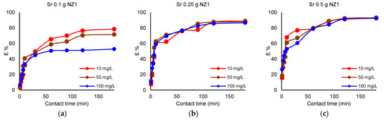 Removal efficiency (%) of Sr2+ by different NZ1 quantities; (a) 0.1 g, (b) 0.25 g, (c) 0.5 g; V = 50 mL; 200 rpm; 22 ± 2 °C, 180 min.