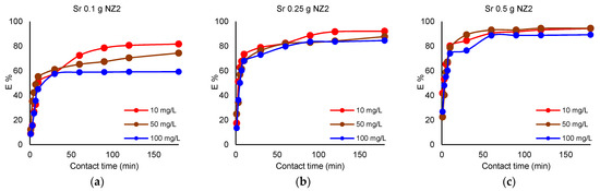Removal efficiency (%) of Sr2+ by different NZ2 quantities; (a) 0.1 g, (b) 0.25 g, (c) 0.5 g; V = 50 mL; 200 rpm; 22 ± 2 °C, 180 min.