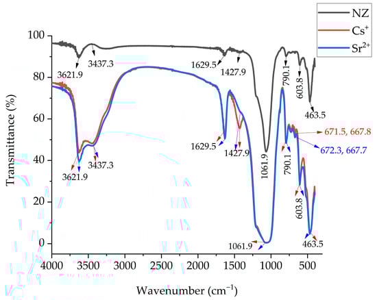 The ICP results have been linked with IR spectroscopic studies to assess the retention mechanisms. FTIR spectra of the zeolitic tuff sample before and after Cs+ and Sr2+ sorption were recorded in the range of 400–4000 cm−1 to identify the presence of functional groups responsible for the sorption process (Figure 5). There are several absorption peaks, indicating the complex nature of the zeolite. The peaks around 1630, and 3622 cm−1 were attributed to H–O–H bending O–H bonding (hydroxyl groups) vibrations and water absorption bands of the clinoptilolite, respectively [35,36]. The main characteristic bands of clinoptilolite were found at the wavelengths of 464 cm−1 resulting from the stretching vibrations of the Al–O bonds, at 604 cm−1 which is assigned to the vibration of the external linkage of the tetrahedral, at 790 and 1063 cm−1 (the most intense band characteristic to silicates) which are ascribed to Si–O–Si and Al–O–Si bonds due to asymmetric stretching vibrations [15,36].