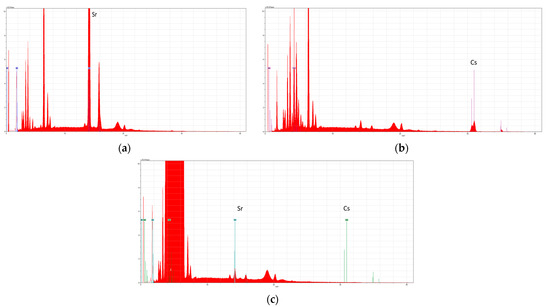 The spectra of zeolite before and after the sorption of Cs+ and Sr2+ were registered by XRF (Figure 6). There was no Cs+ in the zeolite before sorption, but its signal was detected after sorption. In the case of Sr2+, a signal was observed even before extraction, due to a concentration of about 200 mg kg−1 in the natural zeolite, which significantly increased after the extraction.