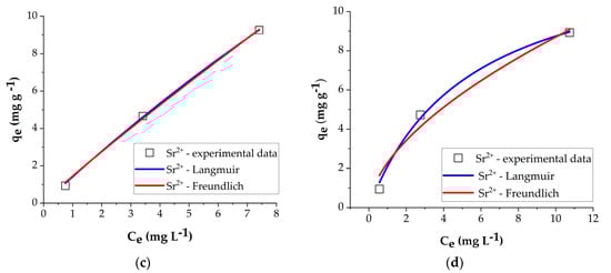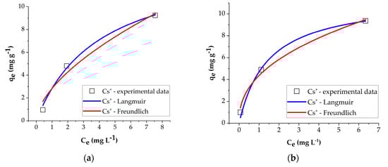 According to the data presented in Table 3, the maximum sorption capacity for Cs+ was 14.22 mg g−1 on NZ1 and 11.46 mg g−1 on NZ2, whereas the maximum sorption capacity for Sr2+ was 68.88 mg g−1 on NZ1 and 13.46 mg g−1 on NZ2.