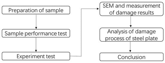 In this study, three steel plates with a thickness of 17 mm were selected to conduct an experimental study on the contact explosion of explosives. The microstructures of the fractures and fragments were analyzed by SEM, and numerical simulations were carried out to restore the experiment. Through the research, the influence law of the different equivalents of explosives and the contact area on the steel plate and the damage mode of the thick steel plate when the explosive is in contact with the explosion are obtained, and the reliability of the numerical simulation is verified according to the experimental results. Finally, through the analysis of numerical simulation results and experimental results, the damage criterion of the steel plate under contact explosion is obtained. The flowchart regarding the overall study is shown in Figure 1. The research results can provide data support and a theoretical basis for theoretical and protection research on steel.