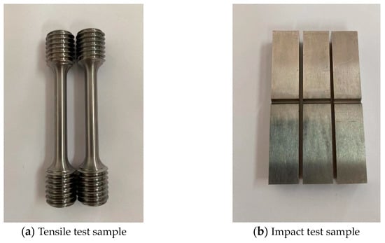 The test specimens are three steel plates with the size 400 mm × 300 mm × 17 mm. The steel plate density is 7.83 × 103 kg/m3, and the grade of steel is X80 steel. The steel plate is cut from a pipe with a diameter of 1219 mm, so the steel plate has a small curvature. Before the start of the experiment, the mechanical properties of the steel plates were tested, and two sets of tensile tests and three sets of impact tests were carried out on the five steel samples (see Figure 2). The results of the samples are shown in Table 1 and Table 2. The mechanical properties of the steel plate can be obtained by averaging the experimental results. The tensile strength is 651.5 MPa, the specified plastic elongation strength (RP0.2) is 544 MPa, the elongation at break is 26%, the area shrinkage is 77.5%, and the impact toughness is 317 J/cm2.
