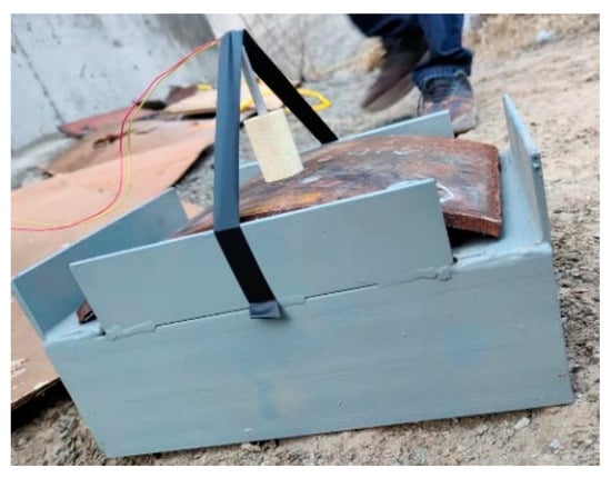 During the experiment, the steel plate was placed in a steel frame (Figure 3). The steel frame is made of a steel plate, and the interior of the steel frame is empty. During the experiment, the length of the contact position between the steel plate edge and the steel frame is 5 cm. At the beginning of the experiment, the steel plate was placed on the steel frame, and the safety operator placed the explosive in the center of the steel plate and fixed it. Finally, the safety operator detonated the explosive, and the experimental process was over.