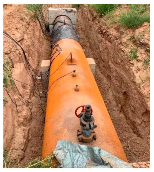 To examine the influence of the size effect and boundary conditions on the experimental results, the experimental comparison between the steel plate and the large-size pipeline was carried out before the beginning of the experiment. The experimental conditions of the steel plate were consistent with this study, and the large-scale experiments were verified using pipeline experiments. The diameter of the pipeline was 1219 mm, the wall thickness was the same as the thickness of the steel plate, and the length was 10 m. The two ends of the pipeline were fixed with concrete piers, and the explosive was placed on the upper part of the pipeline. The experimental layout of large-size pipeline is shown in Figure 4.