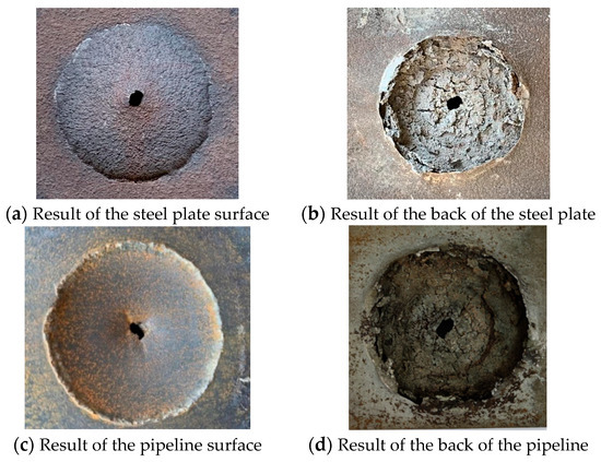 The contact explosion experiments of the pipeline and the steel plate were carried out using the same energy condensed phase explosives. The experimental results are shown in Figure 5. Both the steel plate and the large-size pipe form a circular crater and a circular spall, and the center of the crater is perforated. The experimental results on the back of the pipeline were obtained after cutting the pipe. It can be seen that both the steel plate and the steel plate have oval perforations, large circular craters, and large circular spalls.