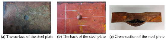 The cross section of the steel plate is shown in Figure 8c. The area near the surface of the cross section is relatively intact, and only a hemispherical defect with a depth of about 4 mm is formed at the center. There is severe damage in the cross section near the back of the steel plate. Severe damage occurred in the area near the back of the steel plate of the cross section. From the cross section, the damage near the lower surface is similar to the triangle.
