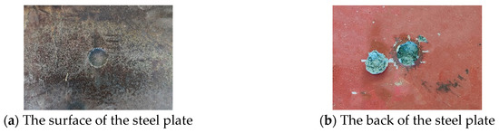 Figure 8 shows the experimental results when the TNT charge of 100 g contacts the steel plate. A 42 mm circular crater is formed on the surface of the steel plate; the depth of the crater is 5 mm, and the diameter of the hole in the center of the crater is 8.5 mm. A 45 mm conical protrusion is formed on the back. A 45 mm circular spall is formed on the back of the steel plate, and a 3 mm diameter circular hole appears in the center of the spall.