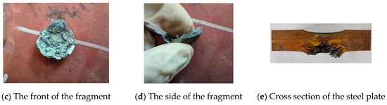 The cross section of the steel plate is shown in Figure 7e. It can be seen that the cross section near the surface of the steel plate is intact, and the cross section near the back of the steel plate is severely damaged. The damage range is the largest at the lower surface of the cross section (near the back of the steel plate), and, as the distance between the cross section and the lower surface of the steel plate increases, the damage range of the steel plate decreases. There are three obvious cracks on the edge of the damage. The minimum distance between the damage position of the steel plate and the surface of the steel plate is 5 mm, of which there are small cracks of 3 mm, and the distance without obvious cracks is 2 mm. It can be concluded that when the TNT charge is 50 g, the remaining thickness of the steel plate is 2 mm.
