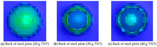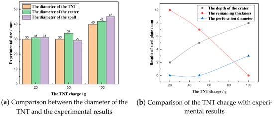 The comparison diagram shown in Figure 9 can be obtained by sorting out the experimental results. It can be seen from Figure 9a that the diameter of the explosive is close to the diameter of the crater on the surface of the steel plate. Furthermore, it can be found that the diameter of the crater on the surface of the steel plate is larger than that of the explosive in the three experiments. The diameter of the spall on the back of the steel plate is smaller than the diameter of the explosive when the TNT charge is 50 g. However, under the action of a TNT charge of 20 g and 100 g, the diameter of the back spall or protrusion is larger than that of the explosive.