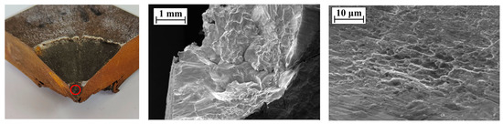 The SEM image of the perforation of the steel plate is shown in Figure 10. The microstructure of the perforation surface of the steel plate is dominated by dimples, from which it can be inferred that the fracture mode of the perforation position is a ductile fracture. The SEM image of the center of the steel plate fragment is shown in Figure 11. There are a large number of torn edges in the microstructure on the surface of the center of the fragment, so it can be considered that the fracture mode of the center of the fragment is a quasi-cleavage fracture; that is, both ductile and brittle fractures exist at the center during the formation of the fragment. The SEM image of the edge of the steel plate fragment is shown in Figure 12. There are a large number of dimples in the microstructure on the surface of the edge of the fragment, thus it can be considered that the fracture mode of the edge of the fragment is a ductile fracture.