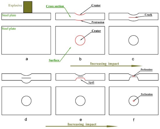 The changing state of the steel plate when the shock wave strength increases. ((a) initial state. (b) Slight bending without cracks. (c) slight bending with cracks. (d) damage mode (I). (e) damage mode (Ⅱ). (f) damage mode (Ⅲ)).