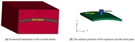 The numerical simulation model is shown in Figure 14, and a full-scale model is used for modeling. Compared with the experiment, the numerical simulation model includes a steel plate, an explosive, and air. The steel frame supporting the steel plate is omitted; the main reason is that the duration of the explosion is extremely short, and the relative sliding between the steel plate and the steel frame can be ignored. Omitting the steel frame does not affect the results of the numerical simulation, and, at the same time, the model can be simplified, and the calculation efficiency can be improved. In the numerical simulation, the steel plate and the explosive are the same size as in the experiment. The size of the air model is 400 mm × 310 mm × 200 mm. The explosive and the air are set to the Euler grid, the grid element adopts a multi-material ALE algorithm, the steel plate is set to the Lagrangian grid, and the fluid–solid coupling algorithm is used between the steel plate and the air and the explosive. The mesh type used is hexahedral mesh. The boundary conditions of the air and the steel plate are set to the non-reflecting boundary.