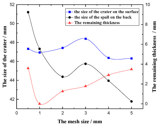 When verifying the grid size of the cross section of the steel plate, six different grid sizes of 0.5 mm, 1 mm, 2 mm, 3 mm, 4 mm, and 5 mm were selected. The simulation results are shown in Figure 15. It can be seen that different cross-section grid sizes have a greater influence on the size of the spall on the back of the steel plate. Meanwhile, with the increase in the mesh size, the remaining thickness of the steel plate first decreased and then increased. In the experimental results, the size of the crater on the surface of the steel plate is 42 mm, the size of the spall on the back is 45 mm, and the size of the spall on the back is larger than the size of the crater on the front. The steel plate is perforated; that is, the remaining thickness of the steel plate is 0. Compared with the experimental results, the size of the cross section of the steel plate is selected to be 1 mm.
