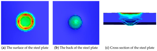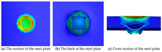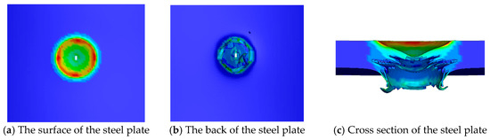 Figure 18 shows the numerical simulation results of the steel plate when the TNT charge of 100 g is in contact with the steel plate. The depth of the outline color represents the plastic deformation of the grid at this position, the white area in the center represents the position where a hole is formed, and the actual deformation can be seen in Figure 18c. A 47 mm circular crater is formed on the surface of the steel plate, and a square hole with a length of 4 mm and a width of 2 mm appears in the center of the crater, and the depth of the crater is about 9 mm. A 47 mm circular spall is formed on the back of the steel plate. The damaged area of the cross section near the upper surface is small. There is severe damage in the cross section near the lower surface, and there are some short cracks at the edge of the failure.