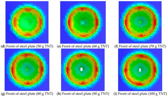 The reliability of the numerical simulation has been verified in the fourth part of this study. In order to obtain a more accurate relationship between impulse and steel plate failure, the numerical simulation study for the explosive charges of 30 g, 40 g, 60 g, 70 g, 80 g, and 90 g was added. The numerical simulation results are shown in Figure 19. It is apparent that when the explosive charge is 20 g, there is a protrusion on the back of the steel plate, that is, the steel plate is in damage mode (I). When the explosive charge is 30 g~80 g, the failure mode of the steel plate is similar, which belongs to the damage mode (Ⅱ). When the explosive charge is 90 g and 100 g, the steel plate is perforated, which is the damage mode (III) of the steel plate.
