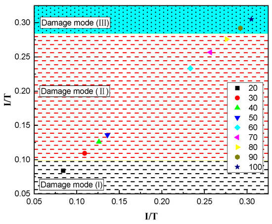 The corresponding relationship between the damage parameter I/T and the damage mode of the steel plate.